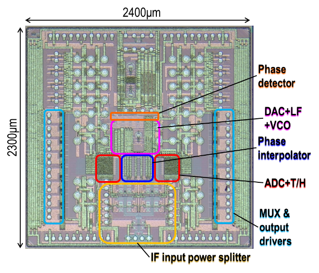 この半導体回路は、キャリア(注7)周波数をシンボル(注8)・キャリア周波数の整数倍にすることで回路を簡素化することができます。キャリア、タイミング(注9)とデータ復元機能を統合する独自の回路構成 (ミックスドシグナルコスタス・ループ) を用いることで超高速情報伝送を実現しました。高速・低解像度ADCは8相タイムインターリーブ(回路全体で出力を8倍速化)毎秒40ギガサンプルの3bit ADCを実装し、これにFPGAを用いてデータを復元することで実現しました。