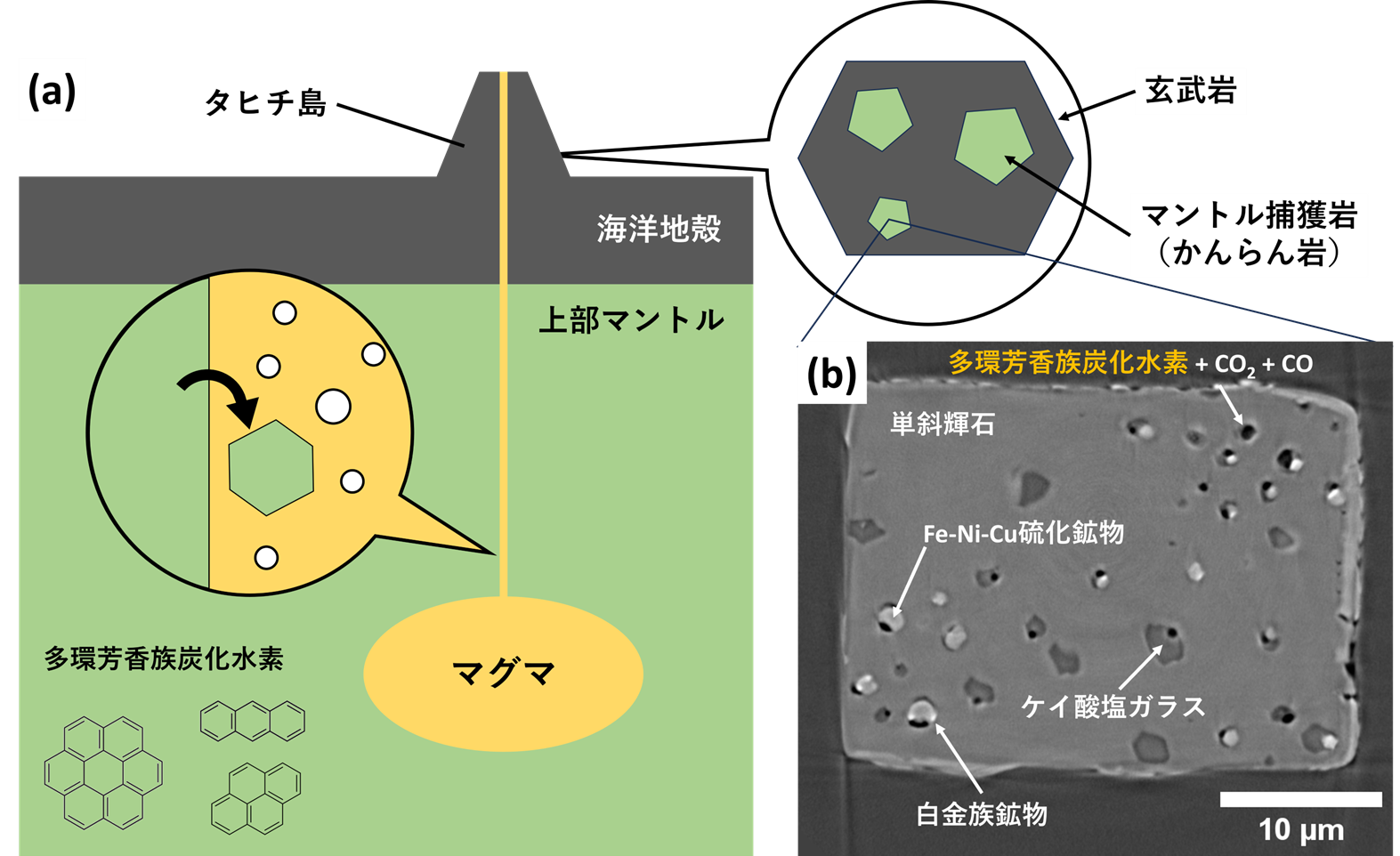 京都大学大学院理学研究科 三津川到 博士課程学生、三宅亮 同教授、伊神洋平 同准教授を中心とし、京都大学、広島大学*、立命館大学、東北大学、高輝度光科学研究センター(JASRI)、早稲田大学、東京大学、高エネルギー加速器研究機構(KEK)物質構造科学研究所のメンバーで構成される共同研究チームは、南太平洋タヒチ島で採取されたマントル捕獲岩中の包有物から、多環芳香族炭化水素を主体とする有機物を発見しました。地球のマントル内部で生物とは無関係に有機物が合成されている可能性は古くから指摘されてきましたが、海洋下のマントルに由来する天然のマントル物質からそのような有機物を検出した例は極めて限られていました。本研究では、放射光X線CTや顕微ラマン分光法などの分析手法を用いて、マントル捕獲岩中の微小な包有物を解析しました。その結果、包有物内に多環芳香族炭化水素を主体とする有機物が、二酸化炭素や一酸化炭素とともに分布していることを明らかにしました。本成果は、生物が関与しない有機物合成が、海洋下のマントルでも起こり得ることを示すものであり、マントル内における有機物合成過程の全容解明に向けた重要な手掛かりとなることが期待されます。
