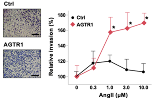 「AGTR1」の発現が高い膀胱がん細胞を人工的に作ったところ、それだけではがん細胞の挙動に変化はありませんでした。しかし、「AGTR1」に結合する血圧上昇ホルモンの「アンジオテンシンII(AngII)」を作用させると、「AGTR1」発現が低い膀胱がん細胞には影響がなかったのに対し、「AGTR1」発現が高い細胞は進行性が高まることがわかりました(図2)。
