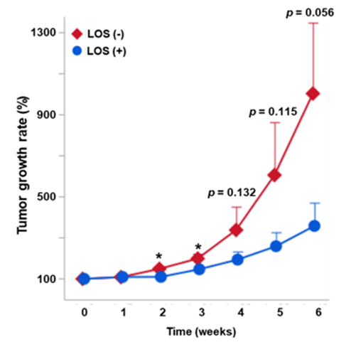 次に、この膀胱がん細胞を皮下移植したマウスモデルを作って調べたところ、「AGTR1」発現の高いがん細胞では、それが低い細胞に比べて腫瘍が増大することがわかりました。また、これらのマウスに「ロサルタン」を内服させることによって、「AGTR1」を高発現する膀胱がん細胞の腫瘍増大が抑制される傾向がみられました(図3)。