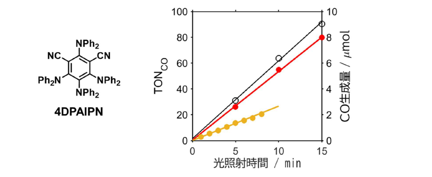 このマンガン錯体触媒と有機色素4DPAIPN*4(図2左)を含む溶液に可視光を照射すると、高い耐久性と効率でCO2がCOへと選択的に変換された。さらにこの光触媒システムは、反応容器中のCO2濃度を10%さらに1%へと低下させても優れた光触媒能を維持した。