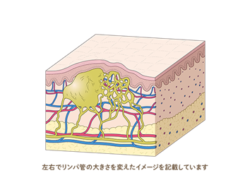 リンパ管奇形とは、生まれつきリンパ管の病気の一種です。リンパ管という管がうまくつくられなかったことで、体の中の老廃物や余分な水分が袋状に溜まりコブをつくってしまう病気で、このコブが顔や首回りによくできるため、気道を圧迫して呼吸がしづらくなったり、見た目上の問題などを引き起こします。