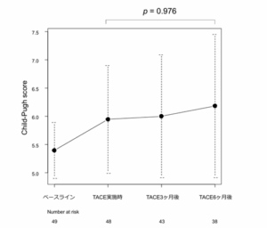 ベースラインからTACE実施時までは肝予備能は軽度悪化していますが、TACE実施の前後ではChild-Pughスコアの悪化は認めませんでした。