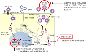 B型肝炎ウイルスは、肝臓の細胞にあるcovalently closed circular DNA (以下、cccDNA)というB形肝炎ウイルスの設計図からHBV RNAというB型肝炎ウイルスの部品の材料となるものを作ります。現在使用されている薬はウイルスそのものの量を大きく減らすことは可能ですが、cccDNAからのウイルス性タンパク質の産生は続く場合があり、長期的な病状の進行リスクを完全には抑えられません。そのため、B型肝炎ウイルスの治療薬の効果を評価する上で、単にウイルスの数を減らせるだけでは足りず、別の指標が求められてきました。