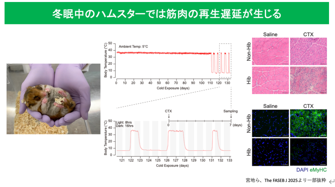 - 実際にハムスターでの筋損傷モデルでも、冬眠中は筋再生が著しく遅延