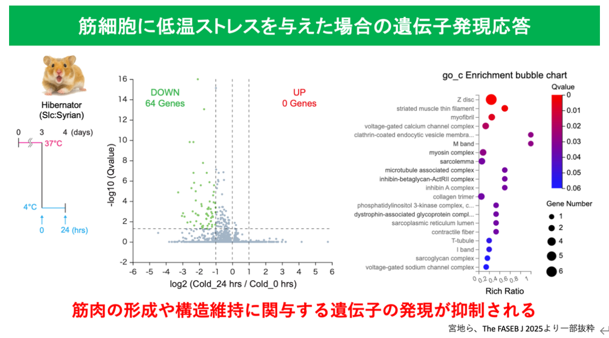 左図は、ハムスターの筋幹細胞を4℃に冷却した際の遺伝子発現を網羅的に解析した結果です。緑色の点は、発現量が統計学的に有意に“減少した”遺伝子を示し、逆に“増加した”遺伝子は1つも見られませんでした。右図は、それら発現が減少した遺伝子の特徴を調べたGene Ontology※5解析の結果で、筋肉の形成や構造維持に関わる遺伝子群が特に大きく抑制されていることが分かります。これらの結果は、低温下で生存した細胞が、筋形成・再生を開始するための遺伝子プログラムを意図的に落としていることを示しています。