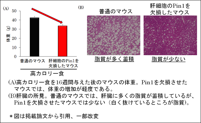本研究では、Pin1という酵素が、上述したMASHの原因である可能性について調べるため、肝臓の大部分を占める肝細胞からPin1を取り除いたマウスを用いて解析を行いました。普通のマウスに高カロリーな餌を長期間与えると、肥満とともにMASHを発症します。一方、Pin1を取り除いたマウスに同じ餌を与えても肥満やMASHになりにくいことがわかりました。
