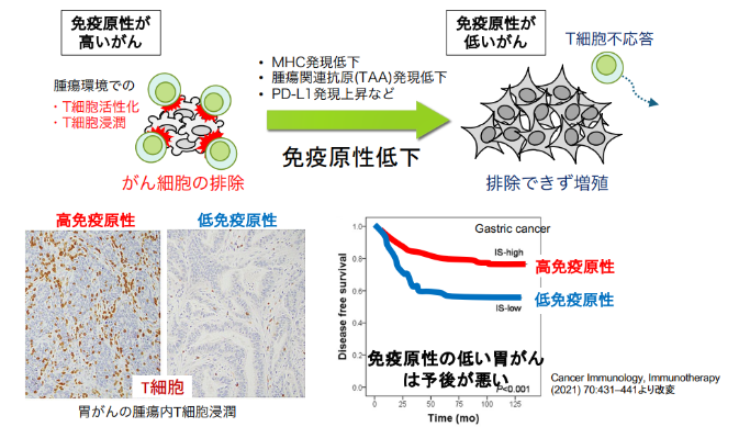 ・免疫細胞であるT細胞が腫瘍内部に活発に浸潤している高免疫原性がんと比較して、T細胞浸潤がほとんどみられない低免疫原性がんは、様々ながん種において特に予後が悪い。