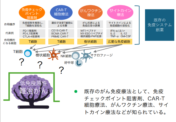 ・低免疫原性の難治がんでは、免疫細胞が認識する目印が消失しており、そのためがん細胞が隠れて見えない状態となっている。これでは、免疫細胞をいくら活性化しても高い治療効果を発揮できない。
