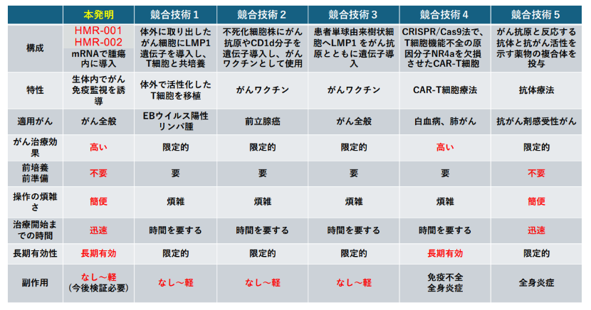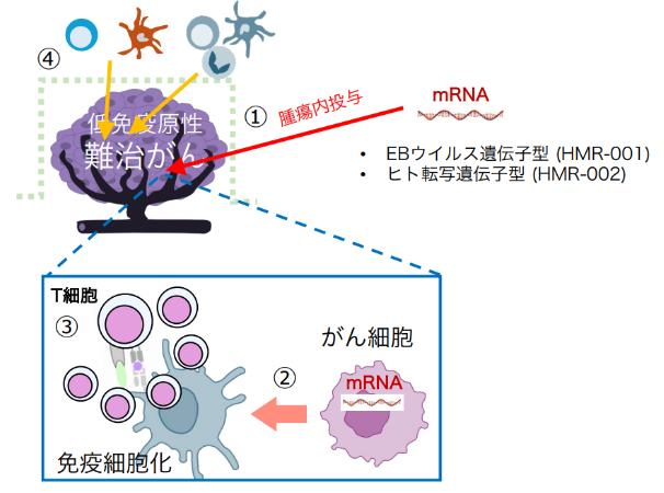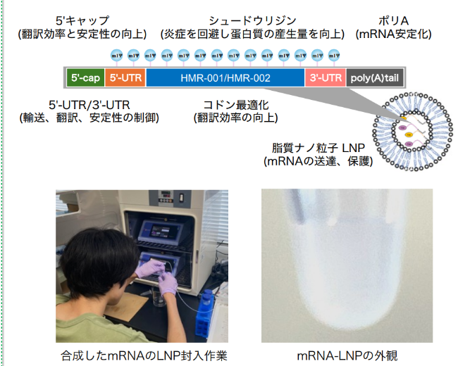 ・これまでに2タイプのmRNA-LNP(1. EBウイルス遺伝子型 (HMR-001); 2. ヒト転写遺伝子型 (HMR-002))を開発し、がん細胞を免疫細胞へとリプログラミングすることに成功。