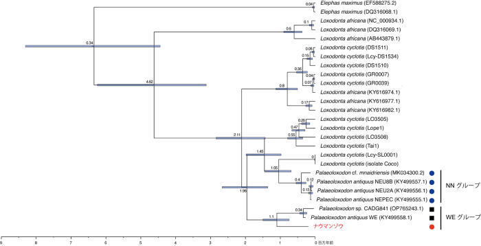 図3:パレオロクソドンの系統樹と分岐年代。色は頭骨の形態を示す:赤=原始的なシュトゥットガルト型、青=ナマディクス型、黒=形態型不明。ナウマンゾウ(赤)はWEグループに属し、約105万年前に分岐した最古の系統である。