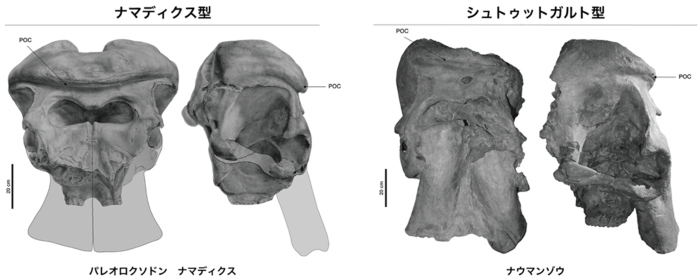 形態学的な研究から、パレオロクソドンには原始的な「シュトゥットガルト型」(頭の骨の隆起が弱い)と、派生的な「ナマディクス型」(頭の骨の隆起が強い)という2つの頭骨形態があり、その関係について長年論争が続いていました(図2)。