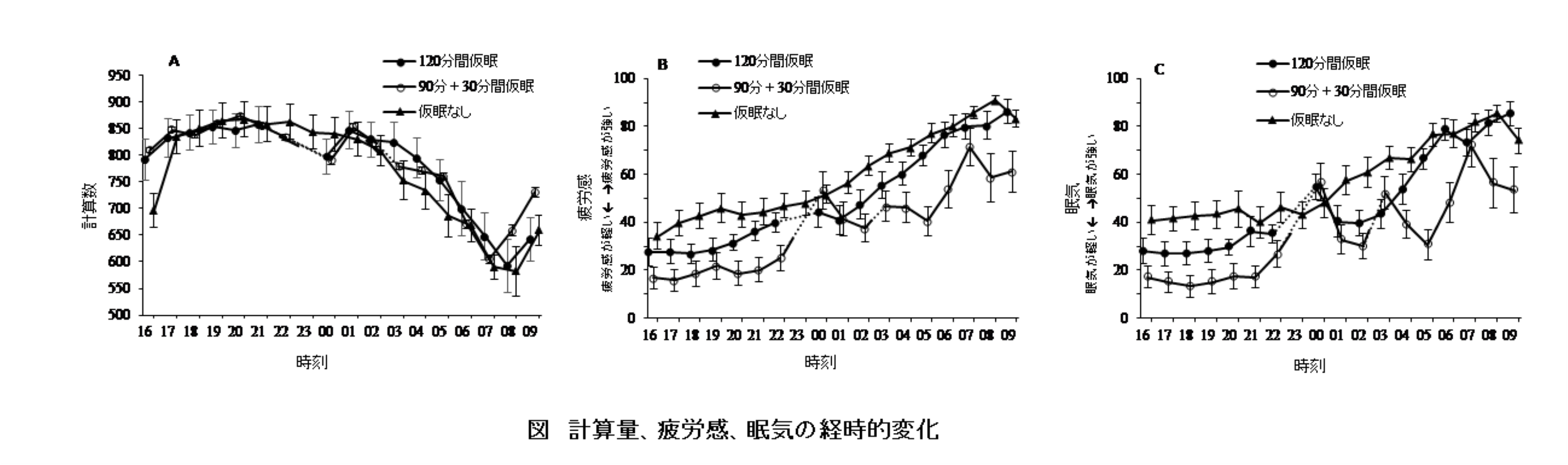 夜勤時の覚醒水準の維持と疲労感の低減を可能とする仮眠のとり方 ~90分間と30分間の分割仮眠と120分間の単相性仮眠の効果~