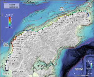 海岸線に沿って510地点で隆起量を計測した結果、隆起量は0.1〜5.2メートルで場所により異なりました(図2)。大きな隆起は北西端の猿山岬付近および北岸の鞍崎周辺で観測され、両側に向かって隆起量が減少する「山形」の分布を示しました。