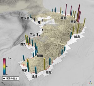 津波の高さは能登半島の西岸で高く、志賀町富来や輪島市黒島で標高8 m以上の地点で津波による漂着物を確認しました。20世紀以降に能登半島北部に到達した津波と比較すると、今回の津波は最大のものであったといえます。