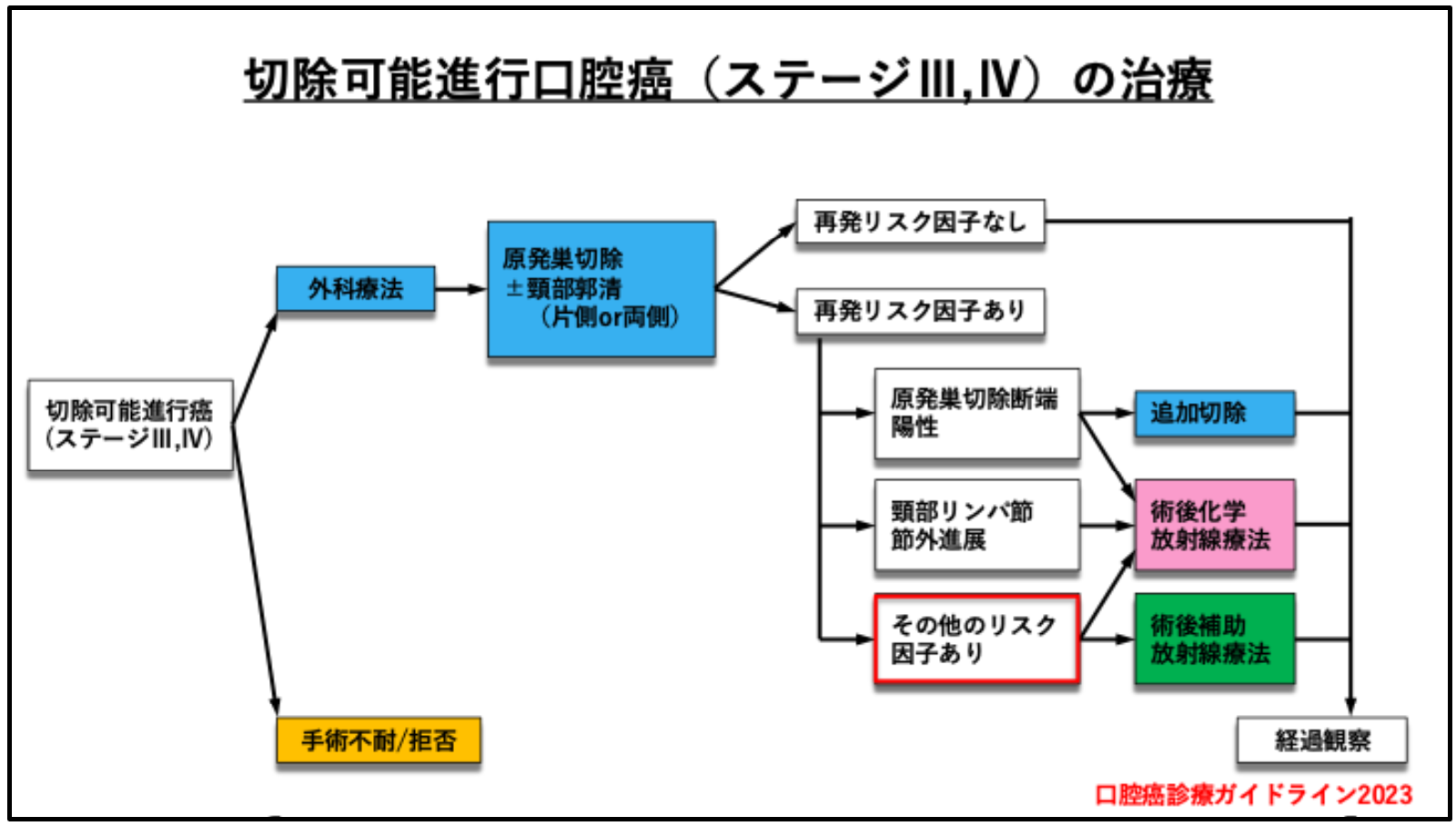 再発中等度リスク因子を有する進行口腔癌に対する術後補助療法は、高リスク症例に対する術後化学放射線療法と比較してエビデンスが十分に確立されておらず、治療選択にばらつきが生じているのが現状です。今後は、中等度リスク症例を一括りにするのではなく、個々のリスク因子の種類や重複数、さらには患者背景を考慮した層別化治療戦略の構築が重要となると考えます。
