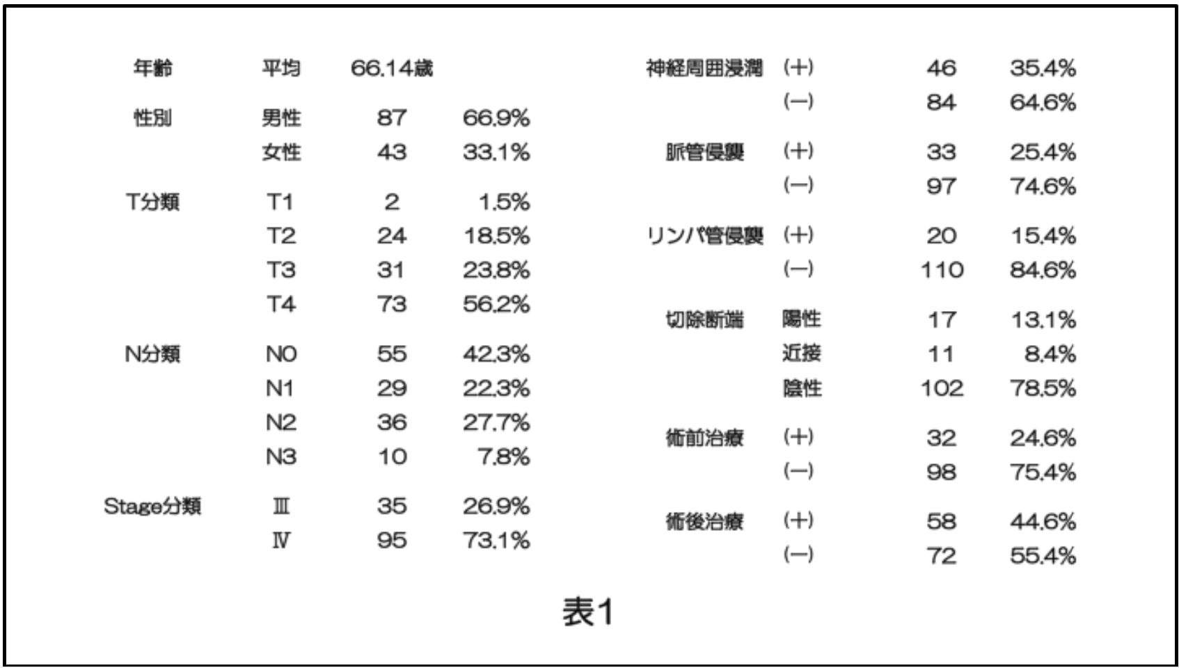 本臨床研究は、2010 年1 月から2023年12 月までに広島大学病院 顎・口腔外科を受診し、一次治療として外科療法を行った進行口腔扁平上皮癌130 例を対象としました(表1)。術後再発の危険因子は、頸部リンパ節の節外浸潤、切除断端陽性といった再発高リスク因子に加え、切除断端近接、病理学的T 分類(pT3 またはpT4)、病理学的N分類(pN2 またはpN3)、レベルIV またはV 領域のリンパ節転移、神経周囲浸潤、血管浸潤、およびリンパ管浸潤といった再発中等度リスク因子としました。これらの危険因子の存在と、術後補助療法の実施、再発または転移の発生、および患者の予後(無病生存期間:DFS)との関連について解析しました。