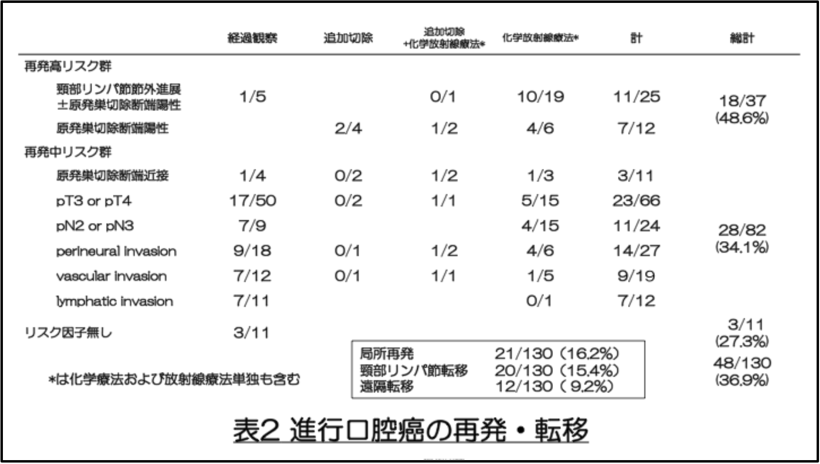 局所再発、頸部リンパ節転移、遠隔転移の発生率はそれぞれ16.2%、15.4%、9.2%で、全体の再発・転移は36.9%でした。再発の危険因子別に解析すると、再発高リスク群48.6%、再発中等度リスク群34.1%、これらの病理学的危険因子をいずれも有さない低リスク群27.3%でした(表2)。
