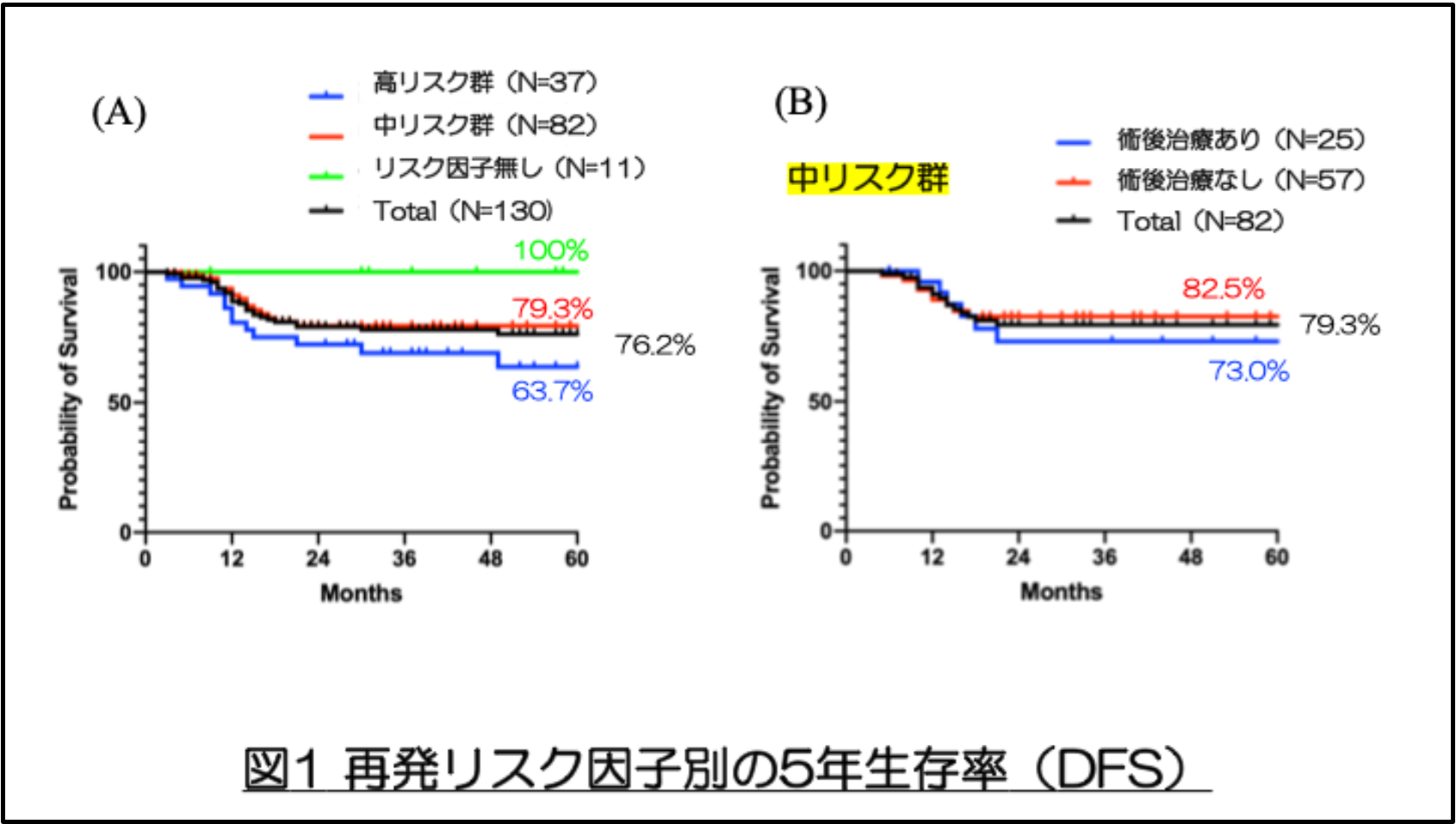 再発リスク因子とDFS の関連を解析した結果、高リスク群、中等度リスク群、低リスク群の5 年DFS はそれぞれ63.7%、79.3%、100%であり、全体の平均は76.2%でした(図1A)。中リスク群において術後療法を受けた患者と受けなかった患者の間でDFS に有意差は認められなかった(図1B)。