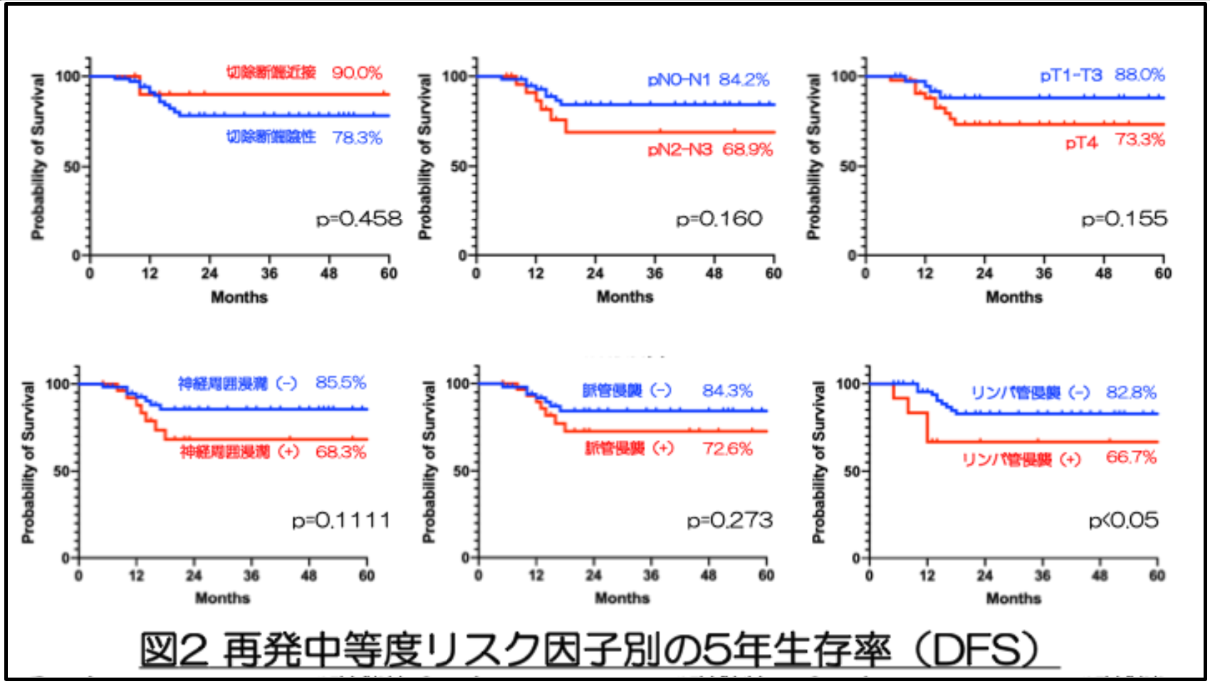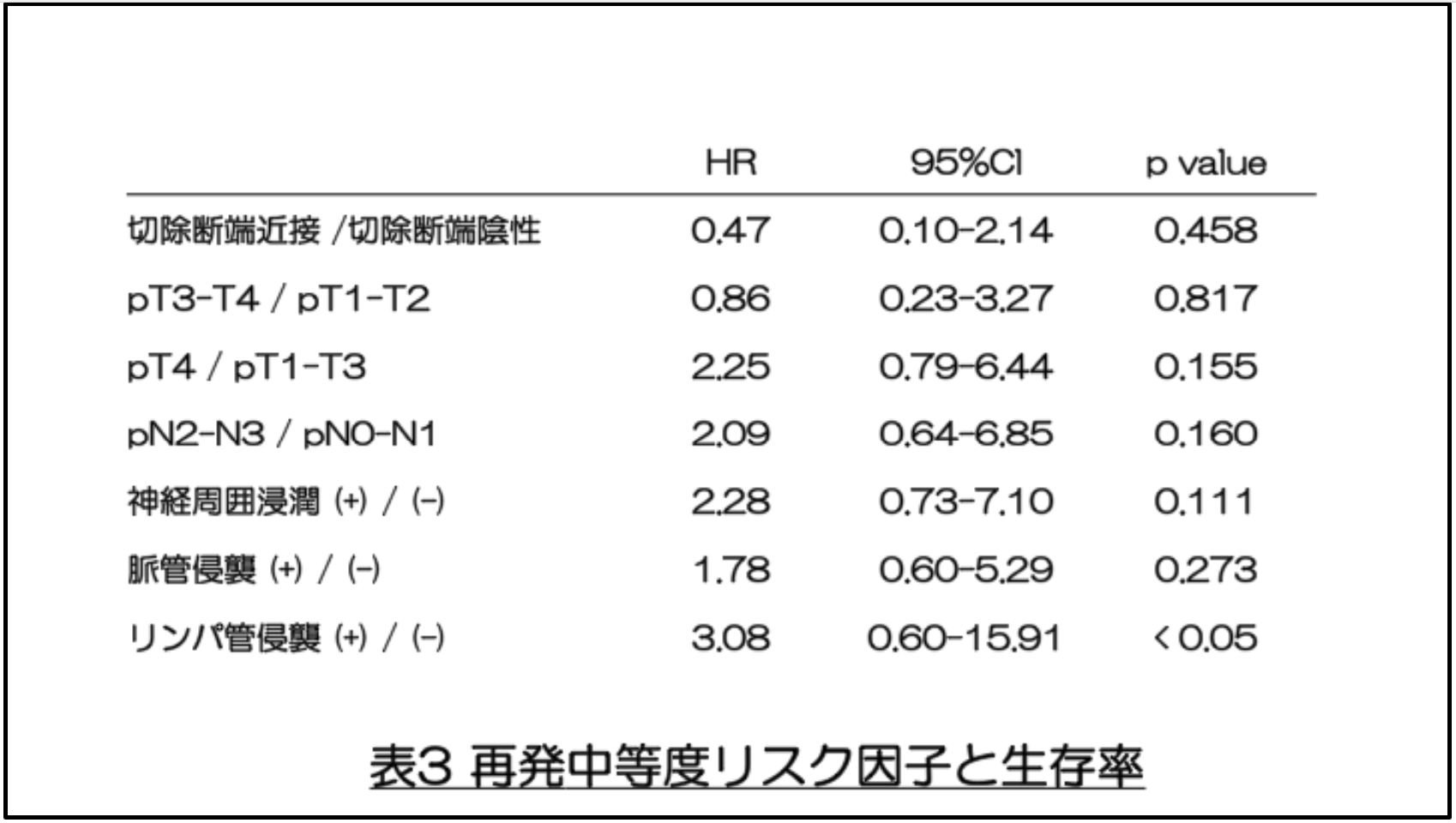 個々の中等度リスク因子別にDFS を比較したところ、リンパ管侵襲を認める患者は有意に生存率が低かった(66.7% vs. 82.8%、p < 0.05)。Cox 比例ハザードモデルを用いた多変量解析でも、リンパ管侵襲の存在は独立した予後因子であることが示され(ハザード比(HR)=3.08、p=0.043)、その臨床的意義が確認された。またpT4、pN2-N3、神経周囲浸潤、脈管侵襲は統計的に有意差には達しなかったものの、いずれの症例においても生存率低下の傾向が認められた。(図2、表3)。