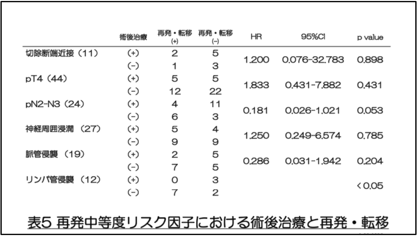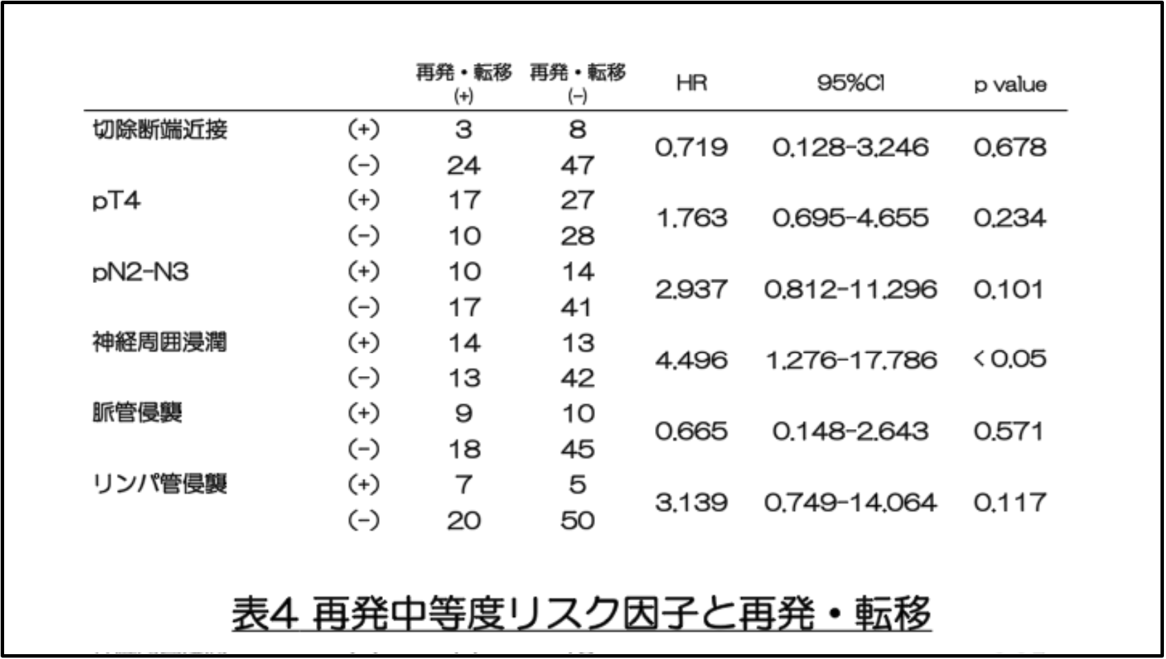 個々の中等度リスク因子別に再発および転移を比較したところ、神経周囲浸潤は有意に高く(51.9% vs. 23.6%、p<0.05)、ロジスティック回帰を用いた多変量解析でも、神経周囲浸潤の存在は独立した予後因子であることが確認されました(HR=4.496 、p=0.019)(表4)。2 つ以上の中等度リスク因子を有する患者では、神経周囲浸潤を伴う症例のみに有意差が認められました。