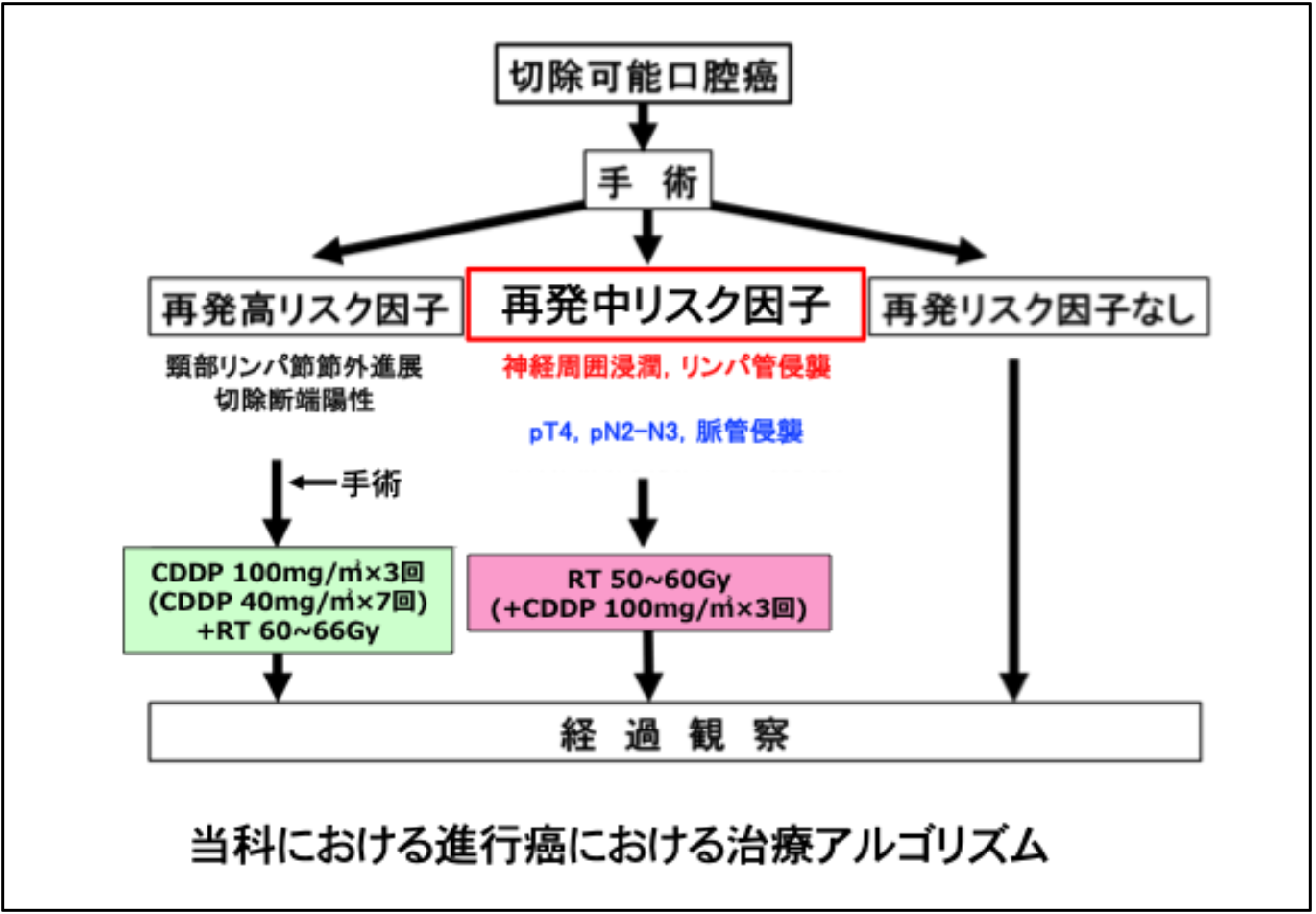 以上より、再発中等度リスク因子を有する進行口腔癌における術後補助療法は、病理学的所見に分子・免疫学的評価を加えた個別化治療へと発展していくことが予想され、治療成績の向上とQOLの両立を目指した今後の研究が求められると考えております。