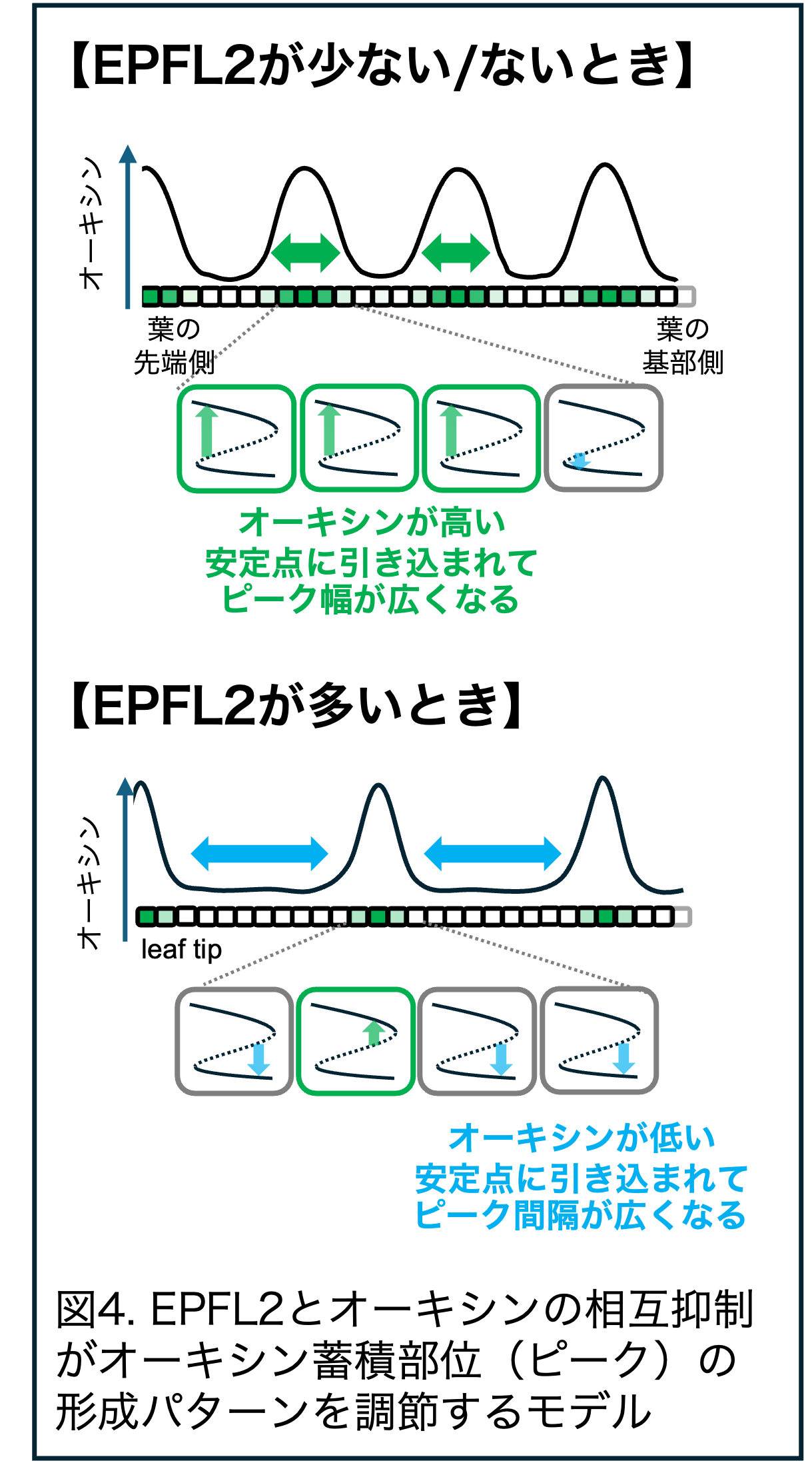 こうして、実験とシミュレー ションの両面のアプローチに基づき、EPFL2とオーキシンの相互抑制的関係が繰り返し起こる形態形成イベントの周期性を変調させる仕組みを提案しました(図4)。