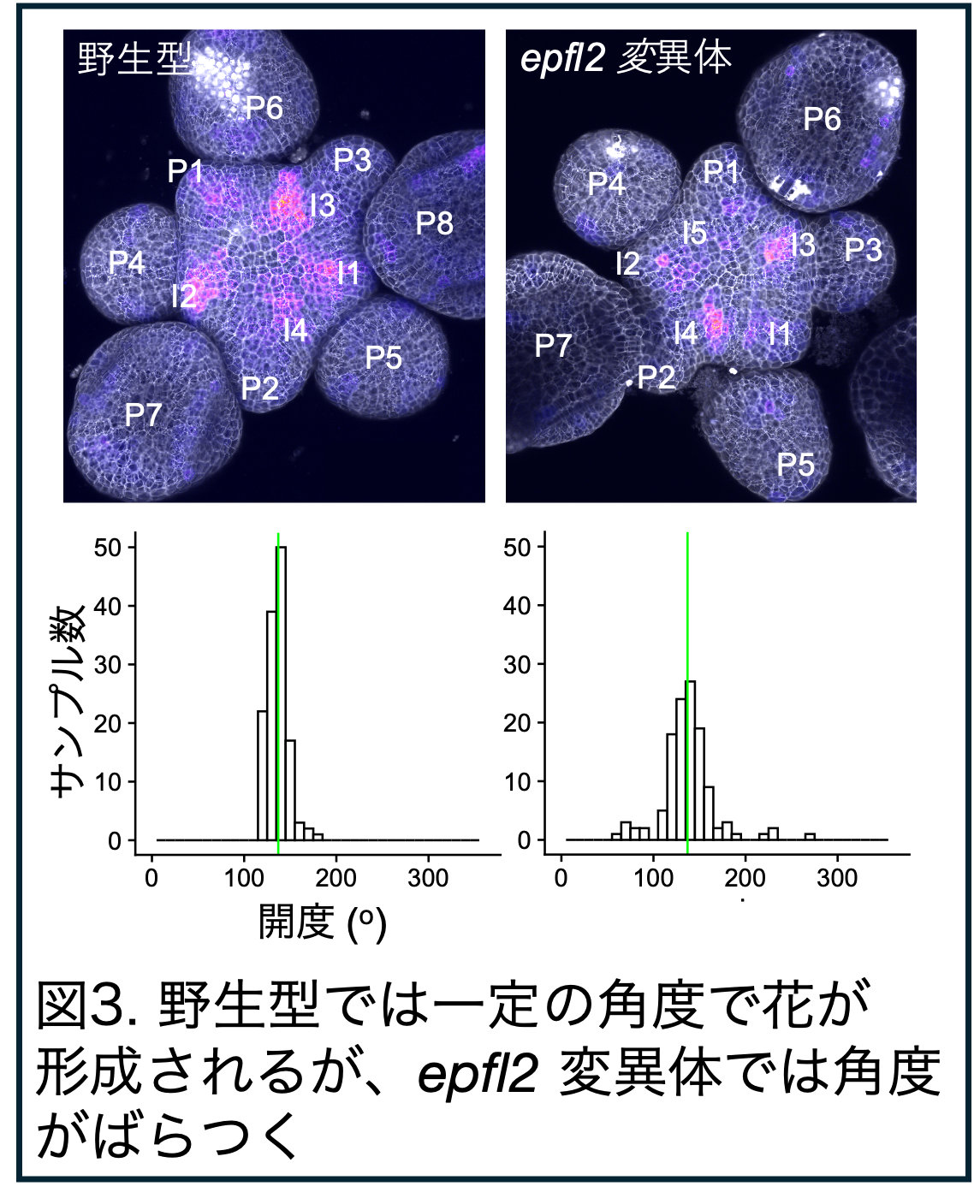 また、EPFL2が規則的な器官配置パターンの形成に必要であることも見出し、EPFL2は植物の形作りを一般的に制御する重要な因子であることを証明しました(図3)。