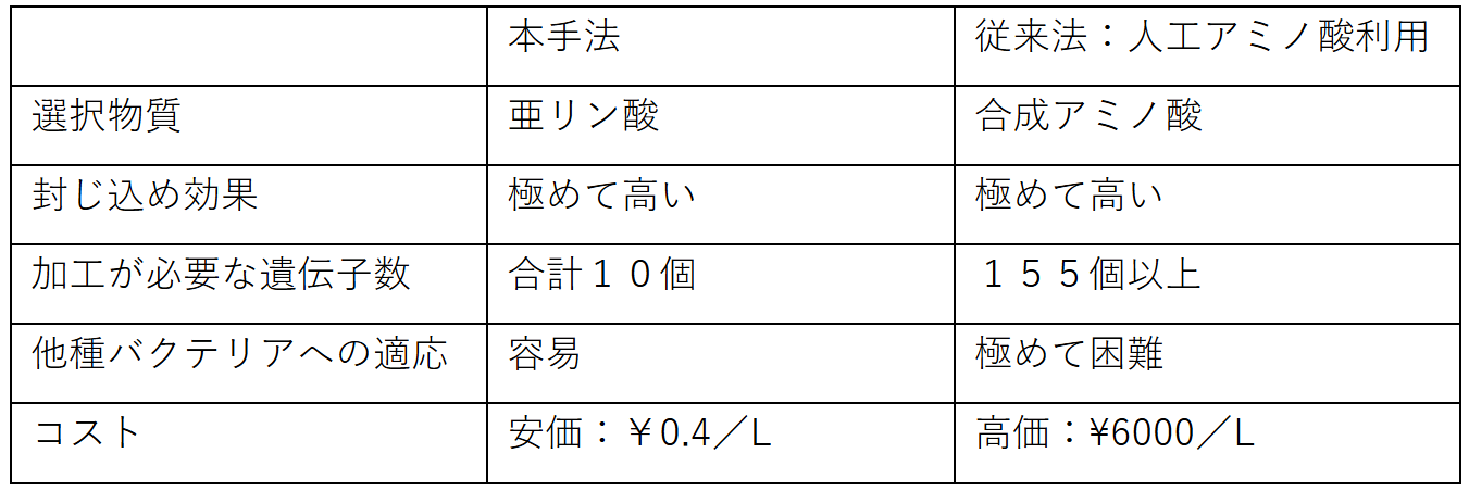 本手法はシンプルであり、大腸菌をはじめとするバクテリアに広く適用可能である。また、培養のコストもかからず、実用向きである。