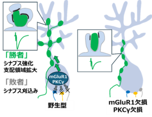 本研究では、マウスを用いた実験により、プルキンエ細胞に豊富に発現する1型代謝型グルタミン酸受容体(mGluR1)―プロテインキナーゼCγ(PKCγ)に至る伝達経路が、「勝者」のシナプス機能と構造を強化し、樹状突起へと配線を広げるために必須であることを解明しました。これまでに、このシグナル伝達経路は、不要な神経結合(敗者)を除去するために必須であることが分かっていましたが、本研究により、必要な結合を強く育て上げ、勝者と敗者の格差を増強する役割も併せ持つことが初めて明らかになりました。
