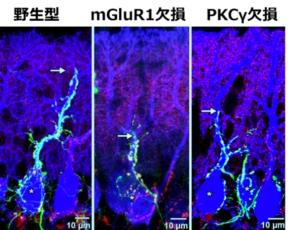 神経標識により可視化した「勝者」登上線維(緑)を共焦点レーザー顕微鏡で観察した。生後12日の野生型マウスでは、発達に伴い「勝者」登上線維がプルキンエ細胞の樹状突起へと広く進展するのに対し、mGluR1 またはPKCγ 欠損マウスでは、その進展と支配領域の拡大が著しく障害されている。この障害は成体になっても回復しなかった。